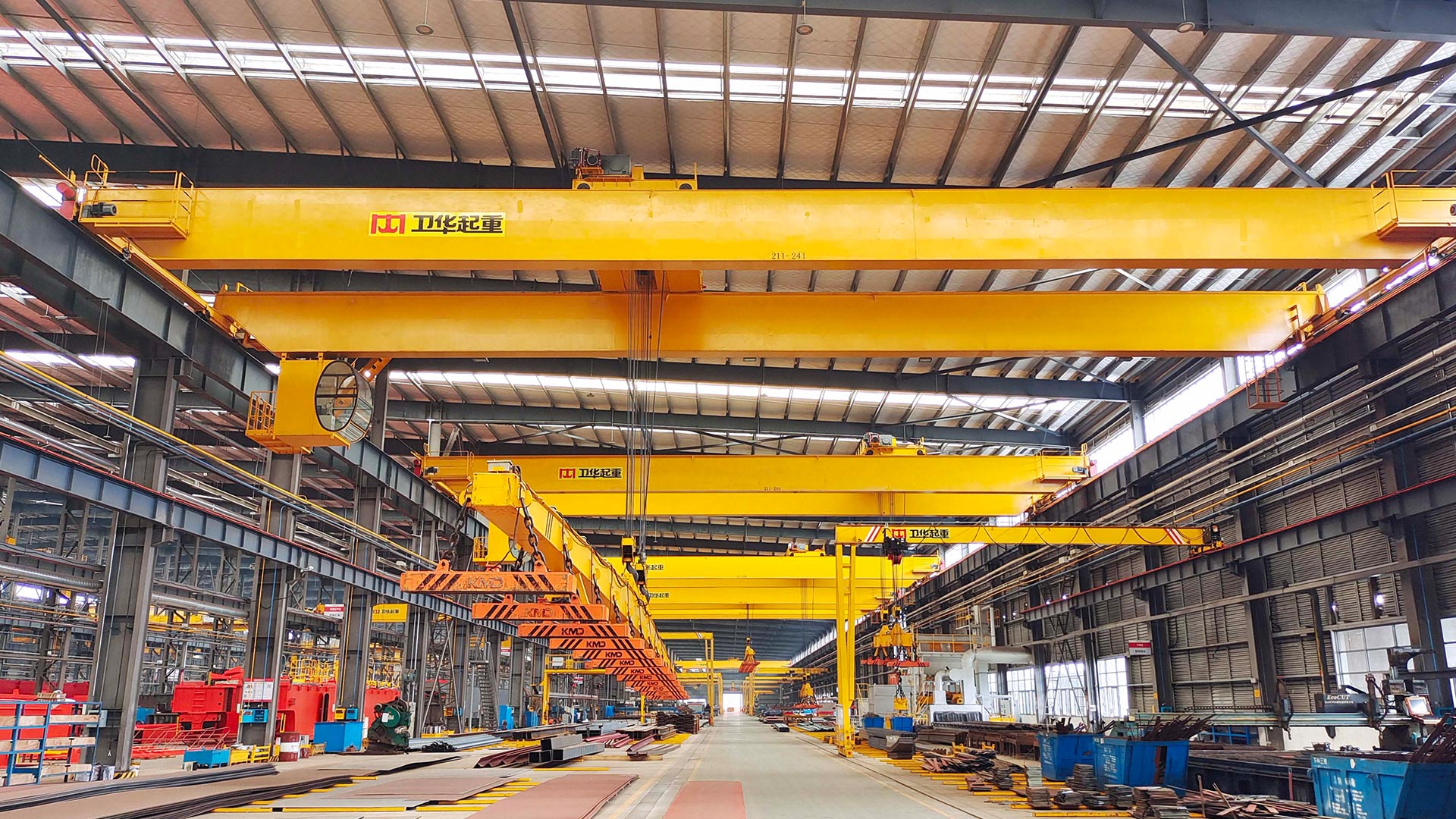 电磁桥式起重机的起升机构采用经典的平行轴线布置方式,小车运行机构采用低速轴集中驱动结构,大车运行采用两侧独立驱动的结构。